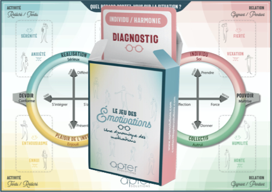 Compuesto por un tablero y una baraja de cartas (56 cartas a dos caras), este juego se utiliza como parte de un coaching / auto-coaching o para dirigir una formación.